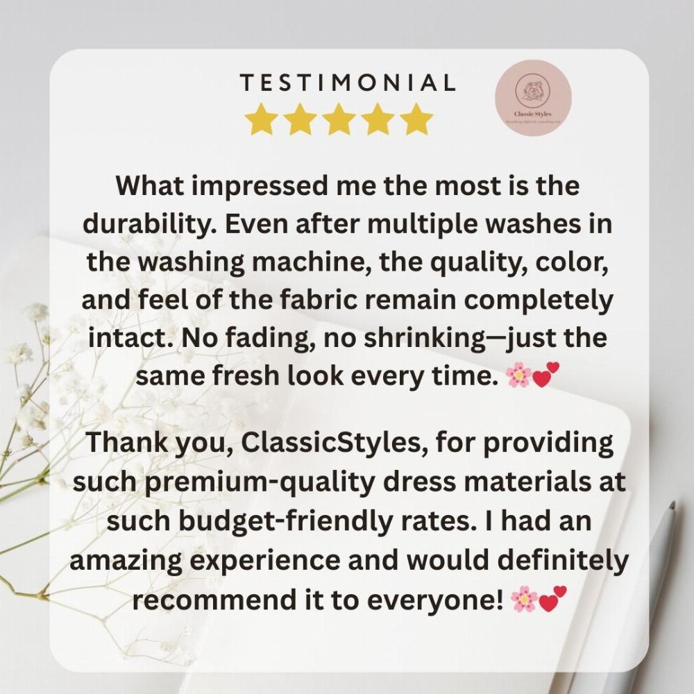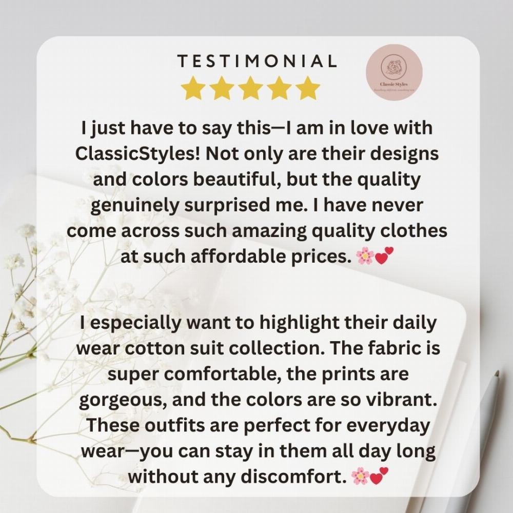 Shahina began her journey on a small scale, focusing on delivering high quality at the right price. Today, Classic Style offers beautiful suits in cotton, muslin, modal, chiffon, and organza — fabrics that perfectly combine comfort with elegance. Alongside clothing, the brand also features artificial jewellery and stunning bedsheets, making style accessible and affordable for every woman.