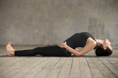 Lie on your back, tuck your hands under your hips, and lift your chest by arching your back. Tilt your head back and rest the crown on the floor. Hold for a few breaths.