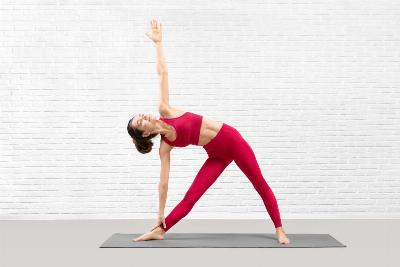 Stand with your feet wide apart, turn your right foot out, and extend your arms to the sides. Reach your right hand down to your ankle and extend your left arm towards the ceiling, forming a triangle shape with your body.