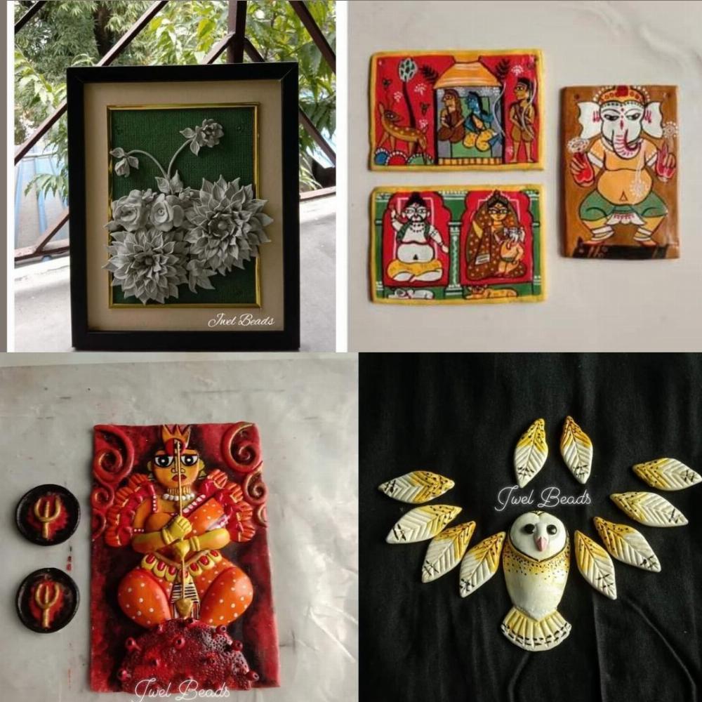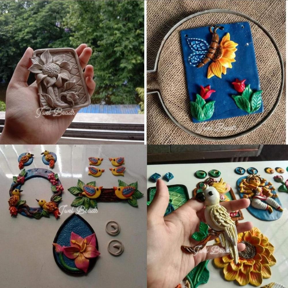 Clay art involves the moulding and shaping of clay into various forms, from intricate sculptures to functional items such as pottery and decorative pieces. She work with different types of clay—air-dry, polymer, or ceramic—each offering unique textures and finishes. This versatile medium allows for the creation of a wide range of items including figurines, jewellery, ornaments, and home décor.