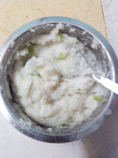 8) Once it is cooked, it not that much sticky anymore. The color of it will get from white to pale yellow. Turn off the stove. Now remove it to a plate or keep the flat pan aside and prepare tadka on top.
